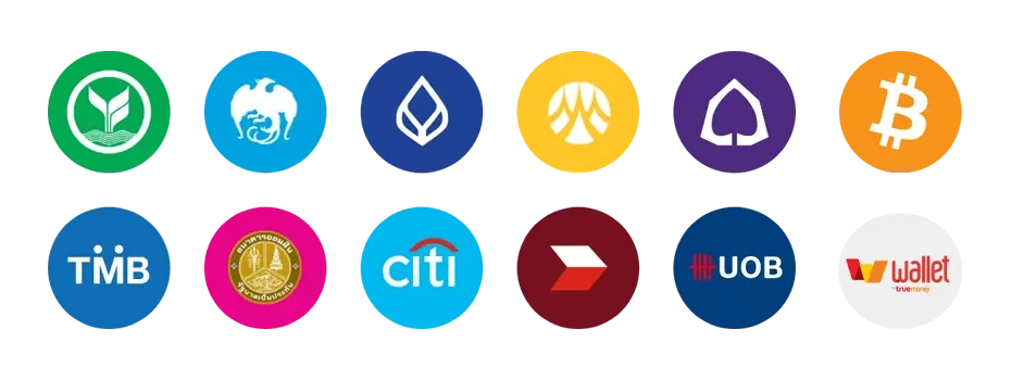 ระบบฝากเงินอัตโนมัติ 24 ชั่วโมง รองรับการโอนผ่าน ทุกธนาคารในไทย ได้แก่ กสิกรไทย, ไทยพาณิชย์, กรุงเทพ, กรุงไทย, กรุงศรี, ทหารไทยธนชาต (TTB), ออมสิน, ธนชาต, ยูโอบี, ซีไอเอ็มบี ไทย รวมถึง TrueWallet สำหรับผู้ที่ไม่มีบัญชีธนาคาร